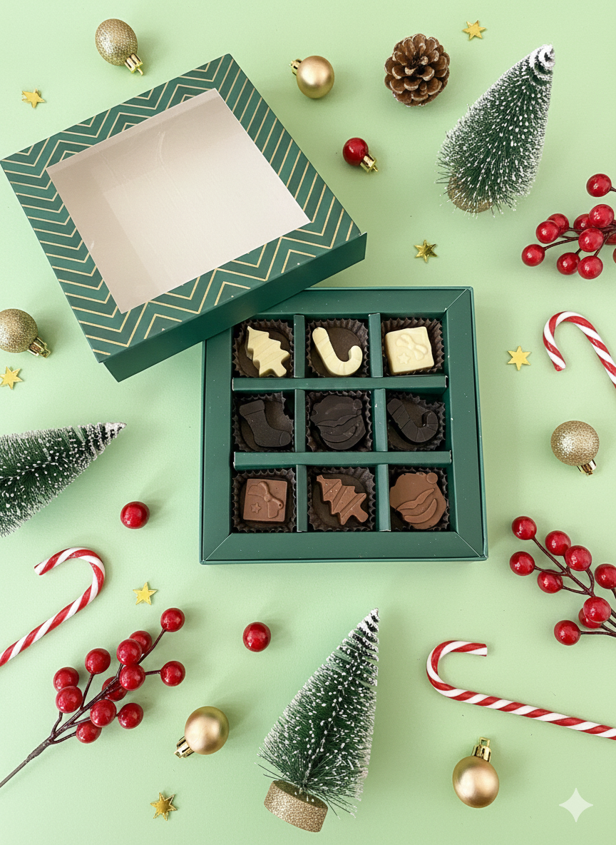 Christmas Chocolate Box – A festive assortment of 9 handcrafted chocolates in milk, white, and dark chocolate, each designed with a delightful Christmas theme. Perfect for gifting, celebrations, and holiday indulgence.