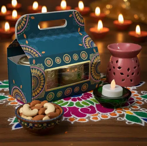 Delight in the festive spirit with our luxurious red box adorned with golden print, featuring a 45% cocoa almond rock chocolate bar (120g), a 45% cocoa real blueberry chocolate bar (120g), a milk chocolate bar (120g), and a reusable golden tin filled with premium mixed dry fruits – a perfect Diwali indulgence.